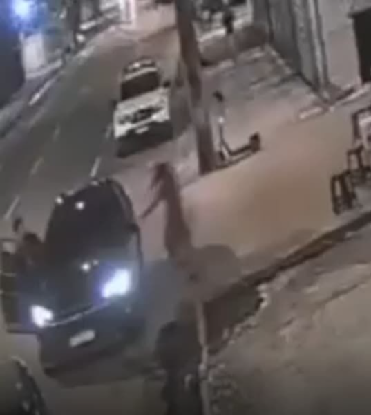Imagens de câmeras de segurança mostram o momento em que o criminoso ordena que os ocupantes desçam do veículo. O motorista obedece e se afasta, enquanto o suspeito entra no carro. Em seguida, o policial reage e efetua disparos, atingindo o homem.